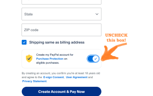 - Just above where you would Submit the payment you will see a BOX that is already selected to “Create my Paypal account for Purchase protection on eligible purchases.” The LONG BUTTON at the bottom states; “Create Account & Pay Now“